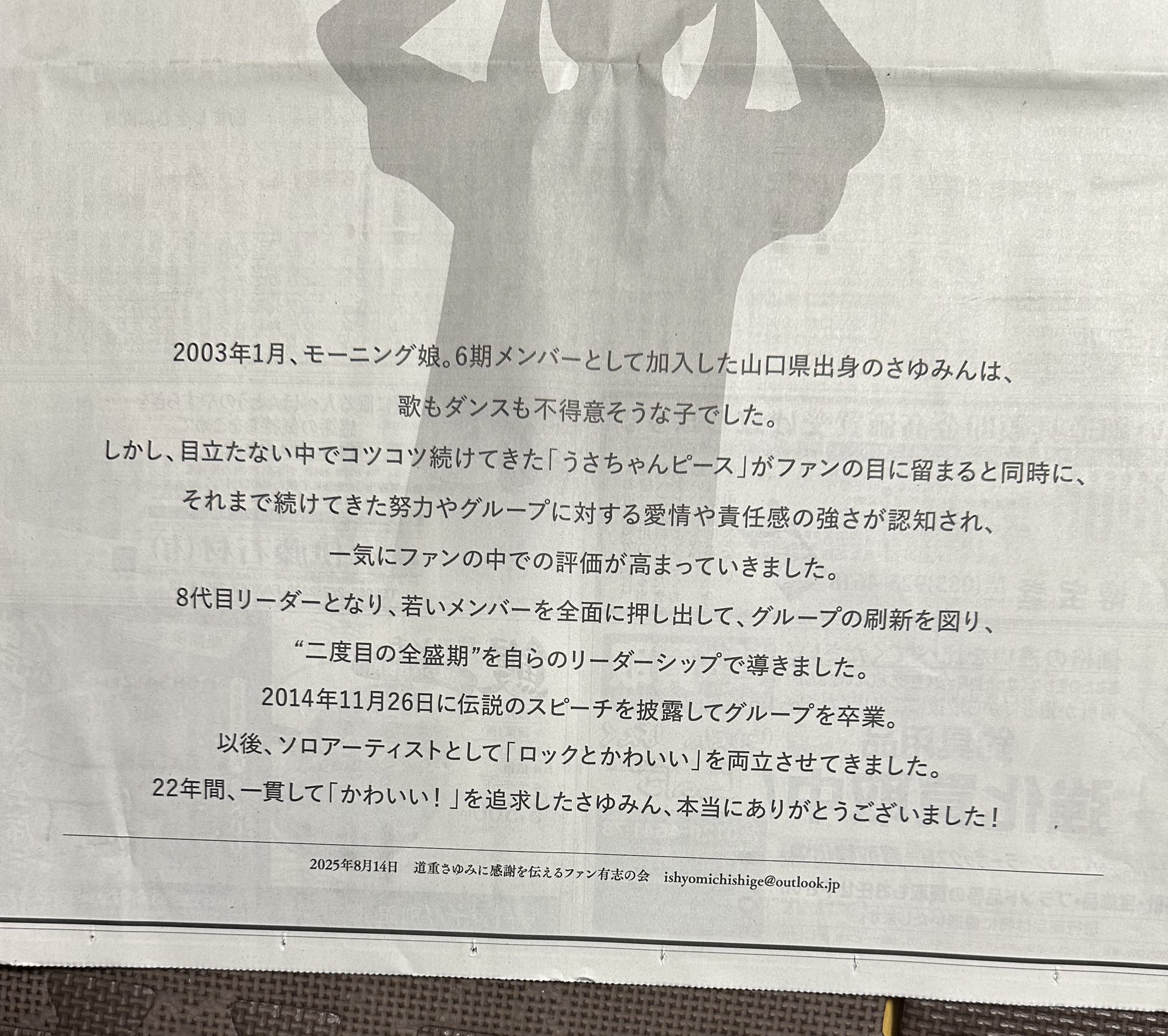 本日、8月14日の山口新聞に道重さゆみさんへの感謝の広告を掲載しました。